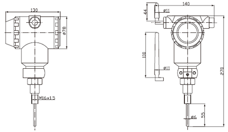 ◆ 溫度變送器出廠的標(biāo)準(zhǔn)配置:溫度探頭不承受壓力,其探頭的長度為55mm,直徑6mm,與管路的機械連接M16×1.5外螺紋。如用戶對溫度變送器的技術(shù)參數(shù)有特殊要求,請事先與我公司聯(lián)系并在定單上注明。