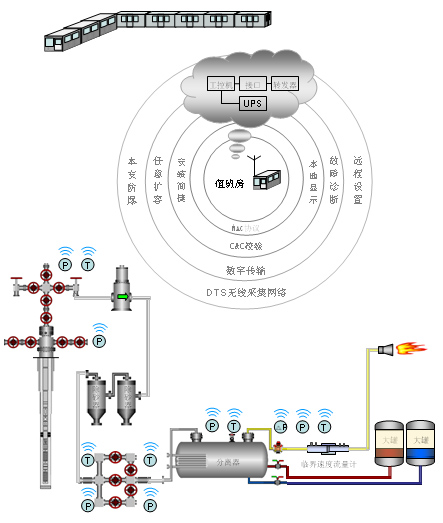 在工業(yè)自動化領(lǐng)域,國際發(fā)展趨勢是由傳統(tǒng)落后的模擬數(shù)據(jù)采集向數(shù)字化、總線化、無線化、網(wǎng)絡(luò)化方向發(fā)展。DTS無線數(shù)據(jù)采集系統(tǒng),就是采用先進(jìn)的無線網(wǎng)絡(luò)通訊技術(shù),多節(jié)點無線組網(wǎng),點對多點無線組網(wǎng);利用無線智能壓力變送器、無線智能溫度變送器、無線智能差壓變送器等電子儀器儀表,結(jié)合先進(jìn)的數(shù)據(jù)采集軟件,實現(xiàn)井口、ESD、除砂器、油嘴管匯、三相分離器、計量罐、加熱爐以及計量間、油氣集輸中轉(zhuǎn)站等地面計量設(shè)備的壓力、溫度、產(chǎn)量等多個現(xiàn)場數(shù)據(jù)的自動采集和錄入。