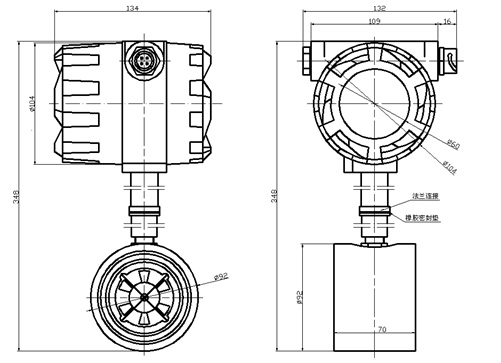 ◆ 總線流量變送器與外部電纜的連接,標準配置為電纜壓線引出方式,如需要其它連接方式,訂購產(chǎn)品時請在合同中注明。