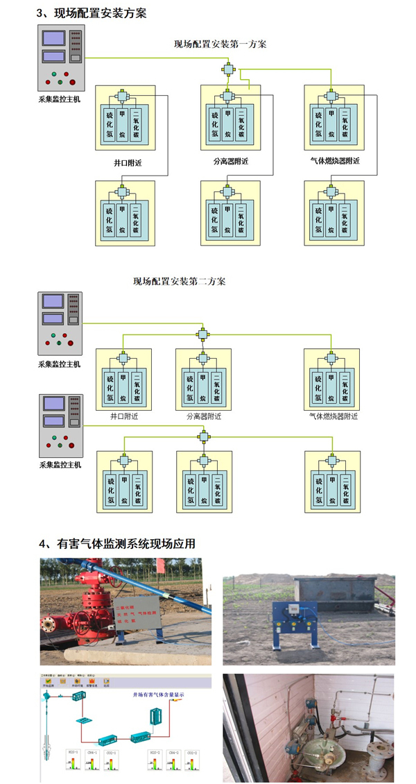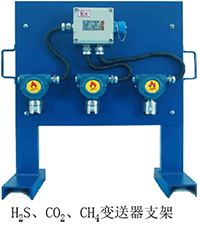 在安全監(jiān)控主機(jī)上,通過現(xiàn)場(chǎng)總線,插接上(H2S、CO2、CH4)變送器,可實(shí)時(shí)對(duì)井場(chǎng)大氣中的硫化氫、二氧化碳、甲烷等有害氣體進(jìn)行監(jiān)測(cè),并超限實(shí)時(shí)報(bào)警。為了現(xiàn)場(chǎng)安裝連接方便,可將(H2S、CO2、CH4)變送器集成固定安裝在同一支架上,支架可分別放置在有毒有害氣體容易泄漏的地方,如井口、分離器及管線氣液出口附近等。
