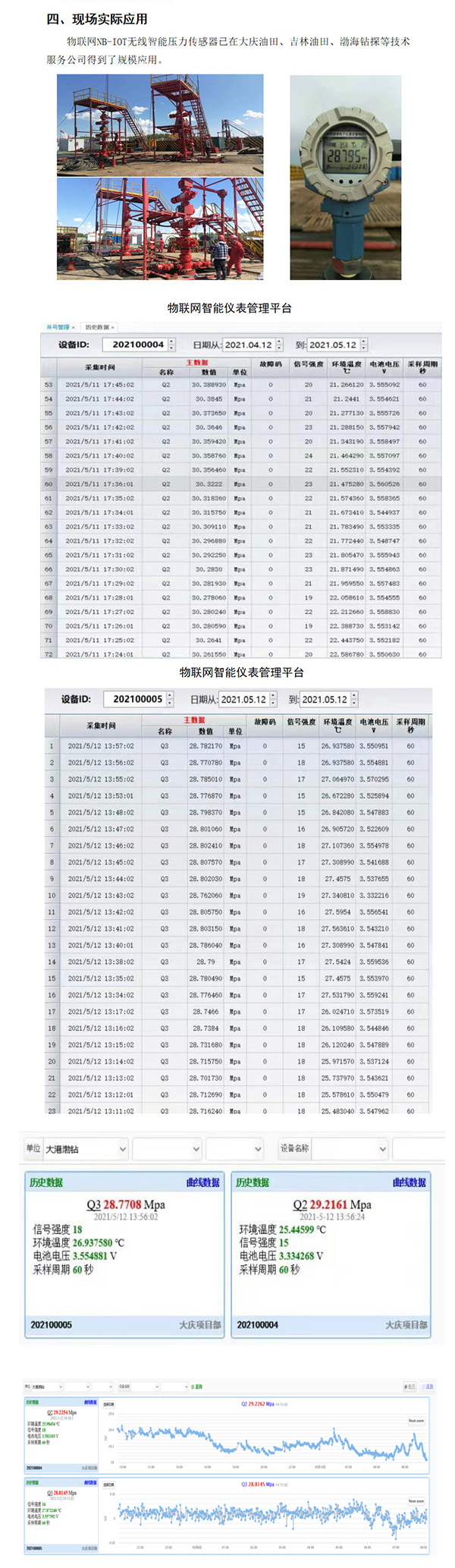 在油田勘探、開發(fā)過程中,許多的油、氣、水井需要長(zhǎng)時(shí)間監(jiān)測(cè)井口油套壓力。許數(shù)的井地處偏遠(yuǎn),受諸多現(xiàn)場(chǎng)條件的限制:一是井場(chǎng)沒有電源,不能給儀器供電;二是井場(chǎng)無人值守,傳統(tǒng)的巡回檢查,巡檢人員工作效率低,勞動(dòng)強(qiáng)度大;三是資料數(shù)據(jù)傳遞不及時(shí)、不連續(xù)。根據(jù)多年來在石油儀器儀表設(shè)計(jì)制造方面積累的豐富經(jīng)驗(yàn)和技術(shù)實(shí)力,結(jié)合現(xiàn)場(chǎng)的使用環(huán)境和具體工況,專門研制了物聯(lián)網(wǎng)BN-IOT無線智能壓力傳感器。